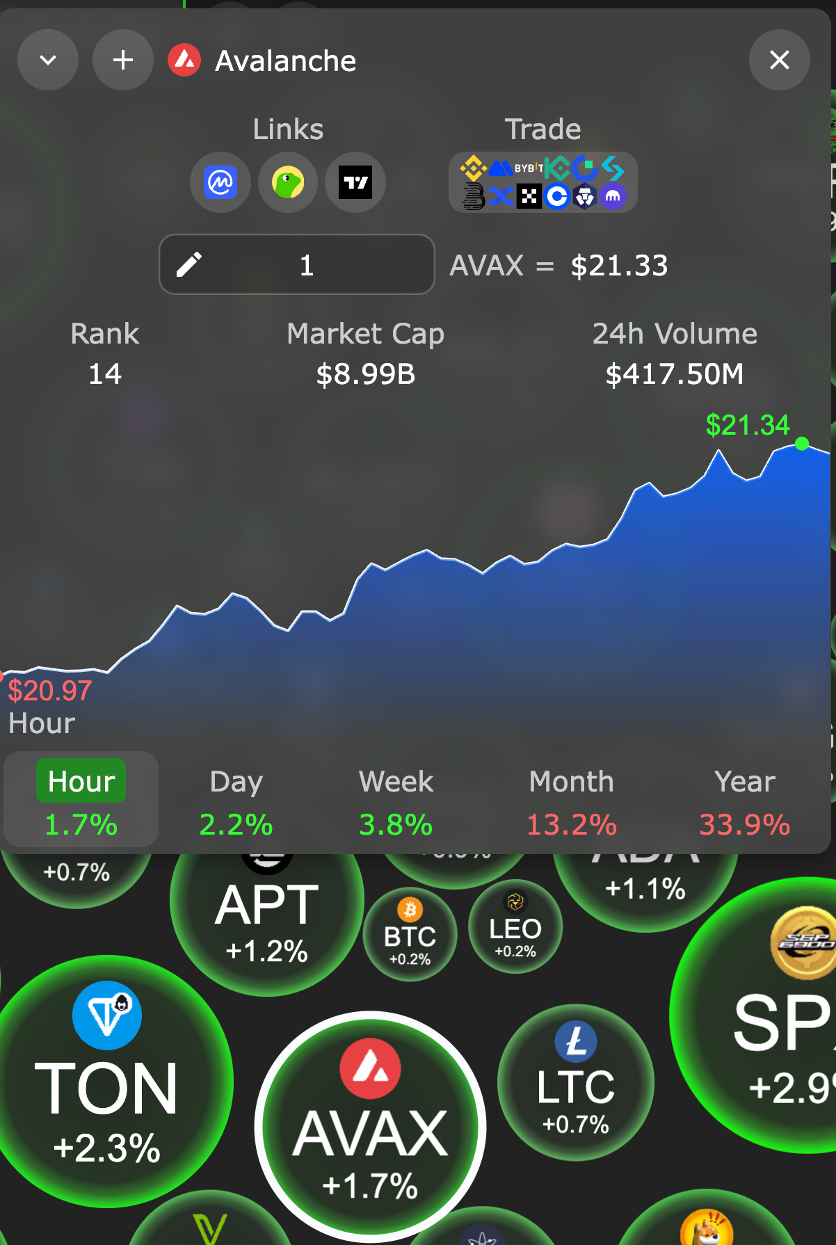 As of 02:05 AM AEST on June 10, 2025, AVAX is trading at $21.08 USD, with a market cap of $8.89 billion and a 24-hour trading volume of $369.58 million. The price has shown volatility, recently recovering from a low of $18.80 on June 6 to its current level, suggesting a short-term bullish momentum.